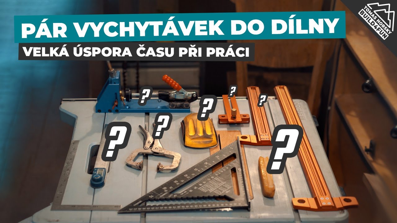 práce se dřevem, dílna, vychytávky, T pravítko, pravítko s dorazem, úhloměr, svrtávací přípravek, čistič brusných pásů, brusný blok, tesařský trojúhelník, trojúhelník